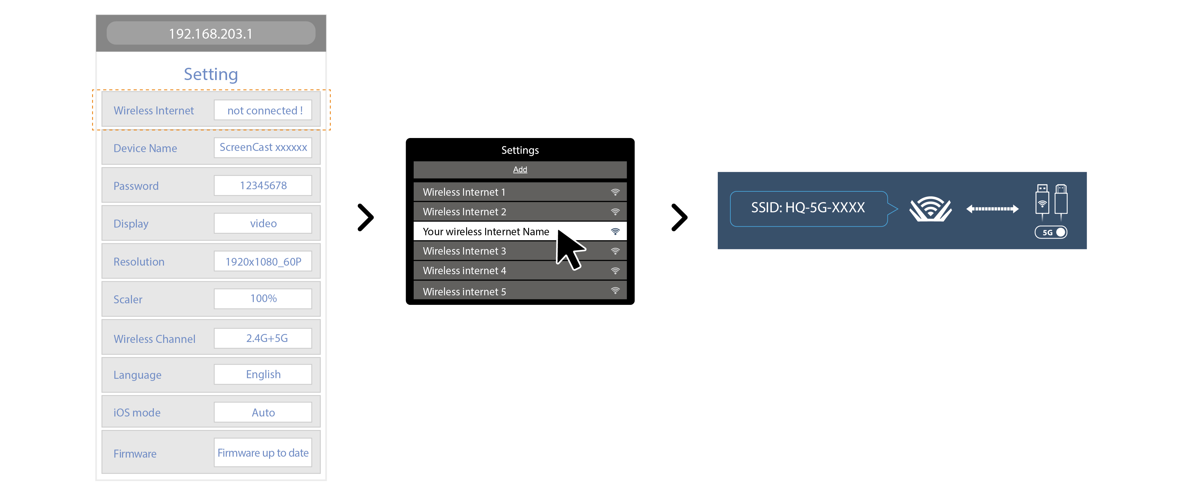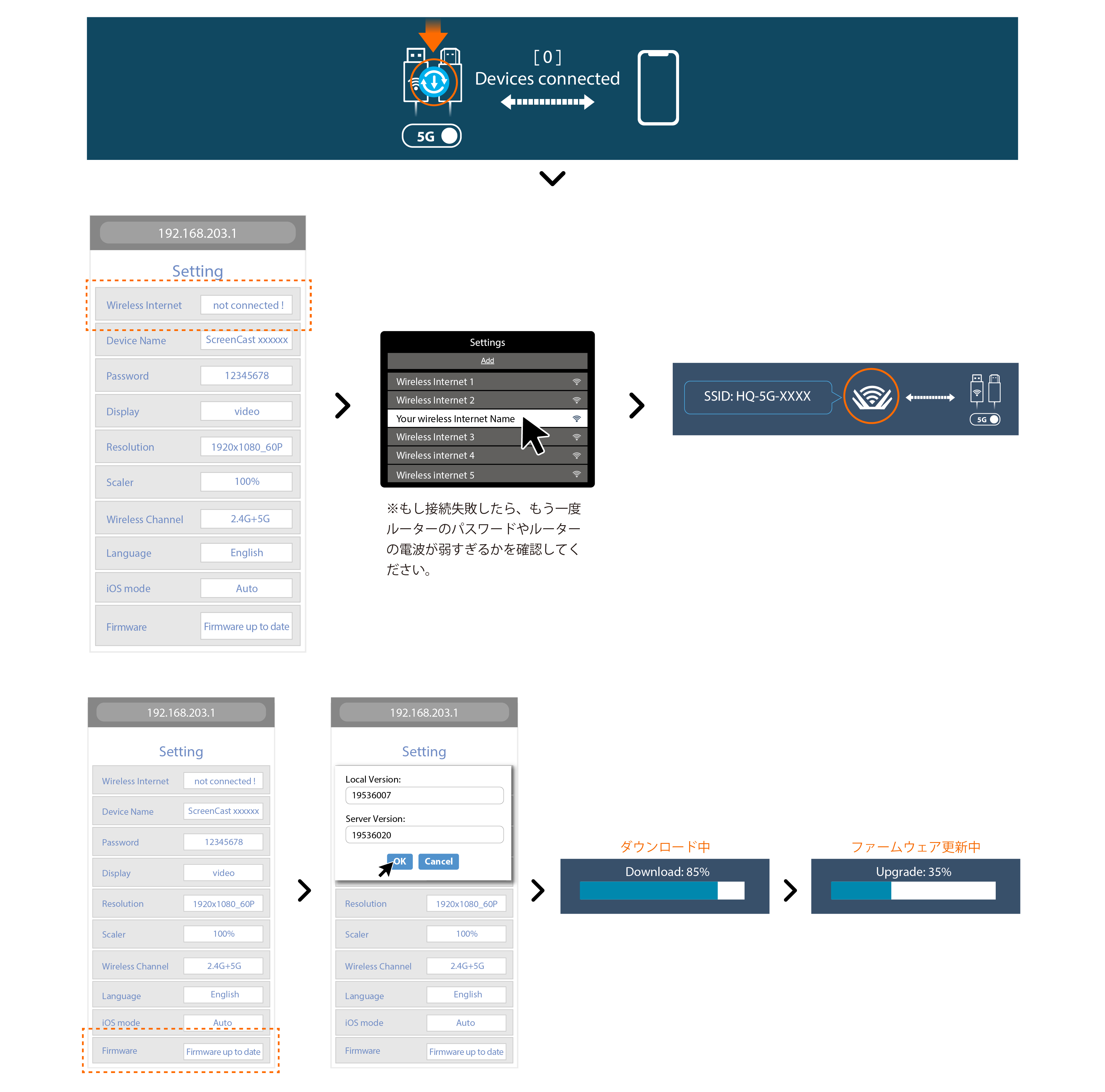 通常は何度も試せば接続成功しますが、またはHDMI端子側のPIN穴を長押しして初期化してルーター回線を解除すればSSIDに接続しやすくなります。