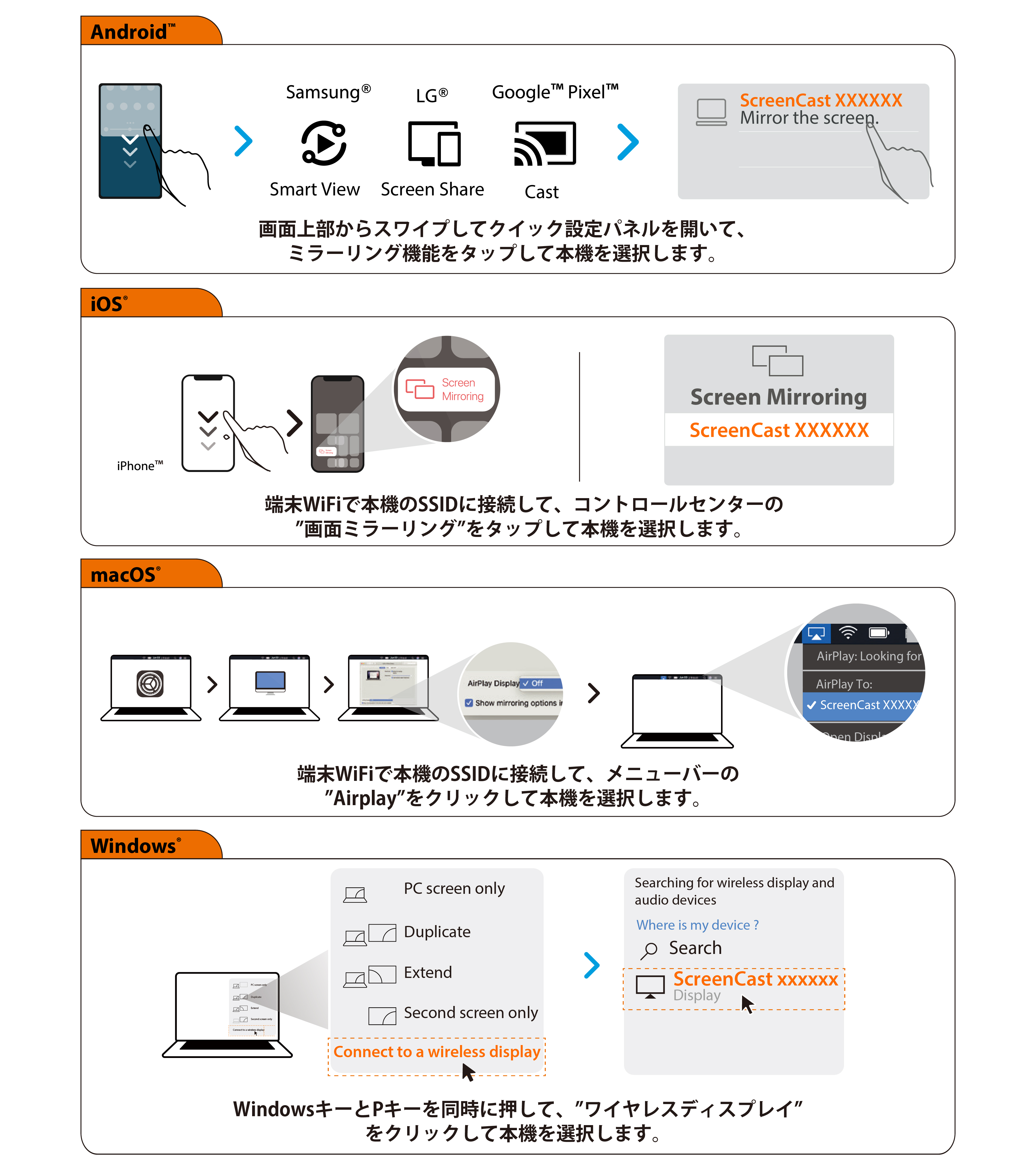 一部のAndroid端末はMiracastに非対応ですので使用する前にメーカーにご確認ください。
